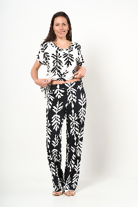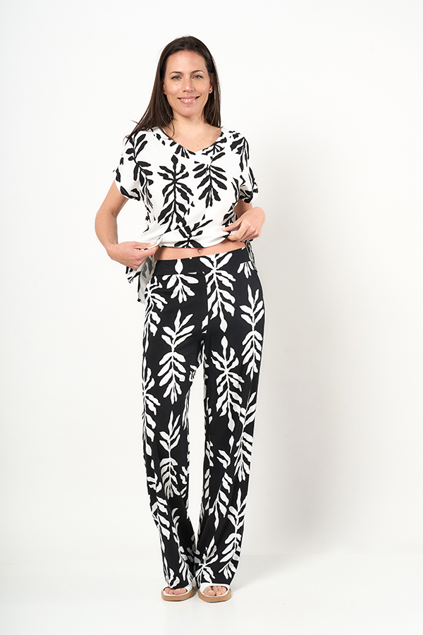 PANTALON PALAZZO LUZ. CINTURA CON ELASTICO TRASERO Y BOLSILLOS LATERALES. TEJIDO LINO SLUB ESTAMPADO HOJAS.