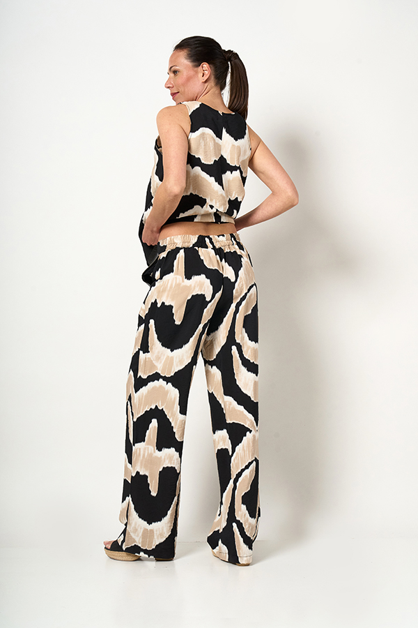 PANTALON PALAZZO SORAYA. CINTURA CON ELASTICO TRASERO Y BOLSILLOS LATERALES. TEJIDO VISCOSA ESTAMPADA.
