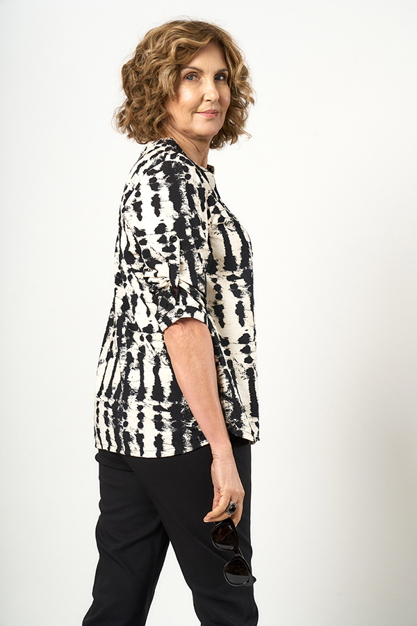 TUNICA NINA. CUELLO MAO CON CARTERA Y MANGA 3/4 CON TRABA, DETALLE TERMINACION CON TAJITOS A LOS COSTADOS. TEJIDO VISCOSA ESTAMPADA.