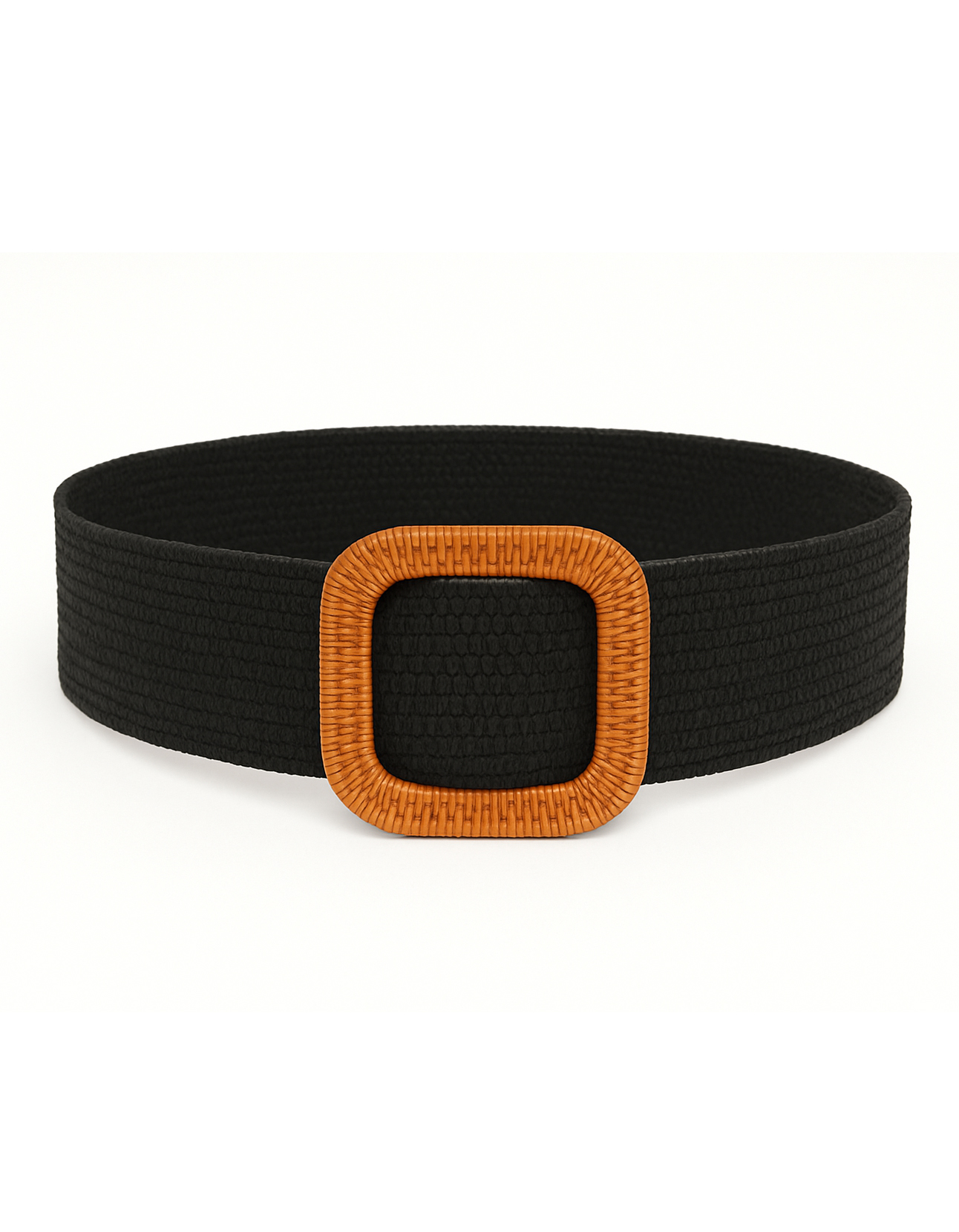 CINTO ALMA. TEJIDO RUSTICO ELASTIZADO, DETALLE HEBILLA RECTANGULAR MARMOLADA.