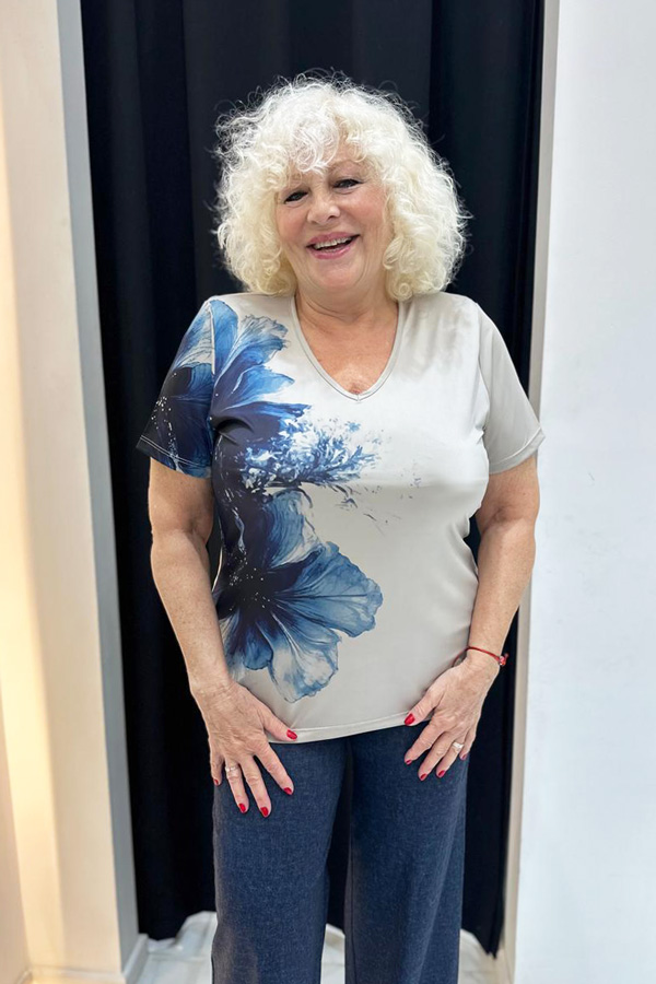 REMERA BRUNELLA. ESCOTE V Y MANGA CORTA, DETALLE DIBUJO FLORES EN FRENTE Y MANGA. TEJIDO VENECIA NAPOLES LISO.