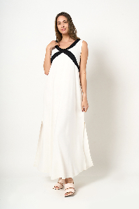 VESTIDO MILAGRO LARGO. ESCOTE V CON RECORTES COMBINADOS MODAL, SIN MANGA. DETALLE BOLSILLOS LATERALES CON TERMINACION TAJOS A LOS COSTADOS. TEJIDO LINO CON SPANDEX Y MODAL CREPE LISO.