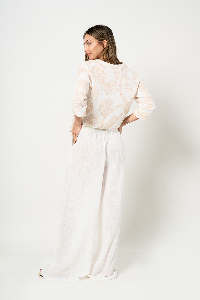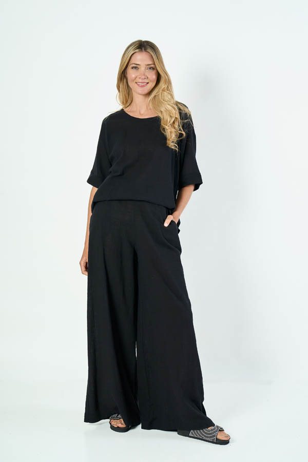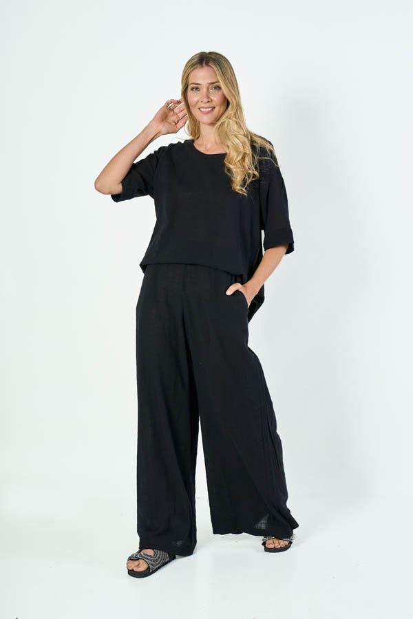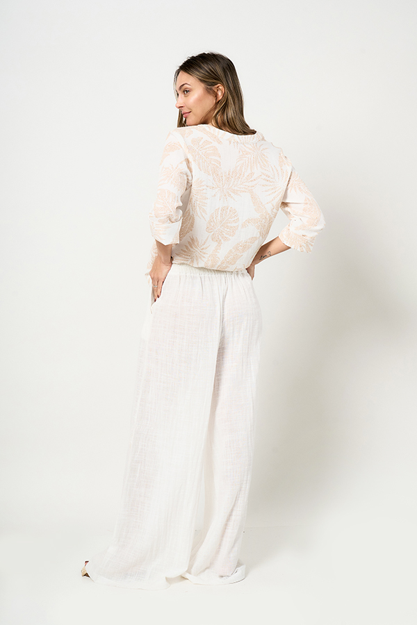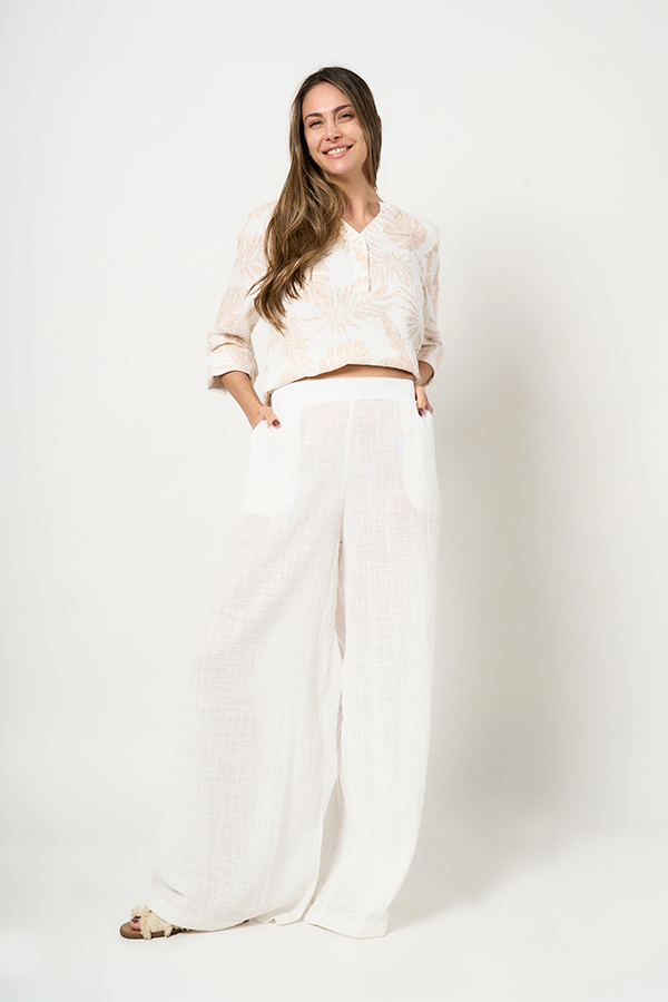 PALAZZO OVERSIZE BRUNA. CINTURA CON ELASTICO TRASERO Y BOLSILLOS LATERALES. TEJIDO MARRAKECH COTTON SLUB LISO.