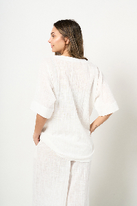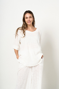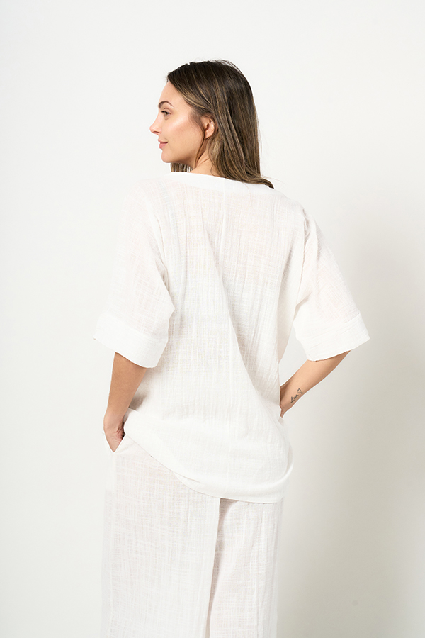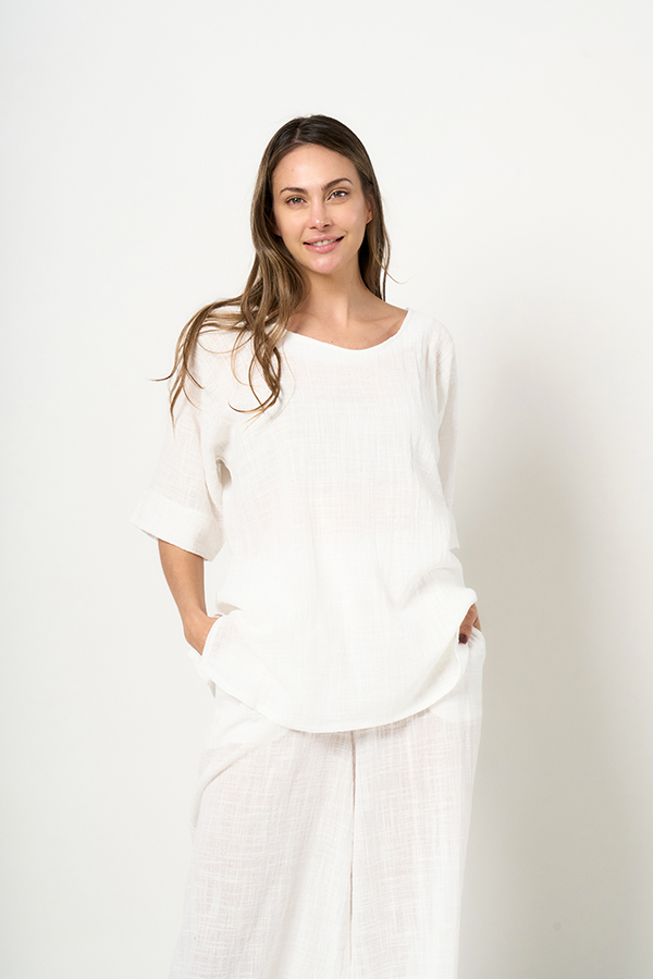 TUNICA BERNARDA. ESCOTE BASE Y MANGA DOLMAN CON PUÃO, TERMINACION TAJITOS A LOS COSTADOS. TEJIDO MARRAKECH COTTON SLUB LISO.