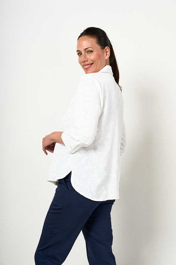 CAMISA ROXANA. CLASICA, CUELLO SOLAPA Y MANGA 3/4, DETALLE TAJITOS A LOS COSTADOS. TEJIDO CAMISERO ESTAMPADO SIMIL BORDADO HOJAS.