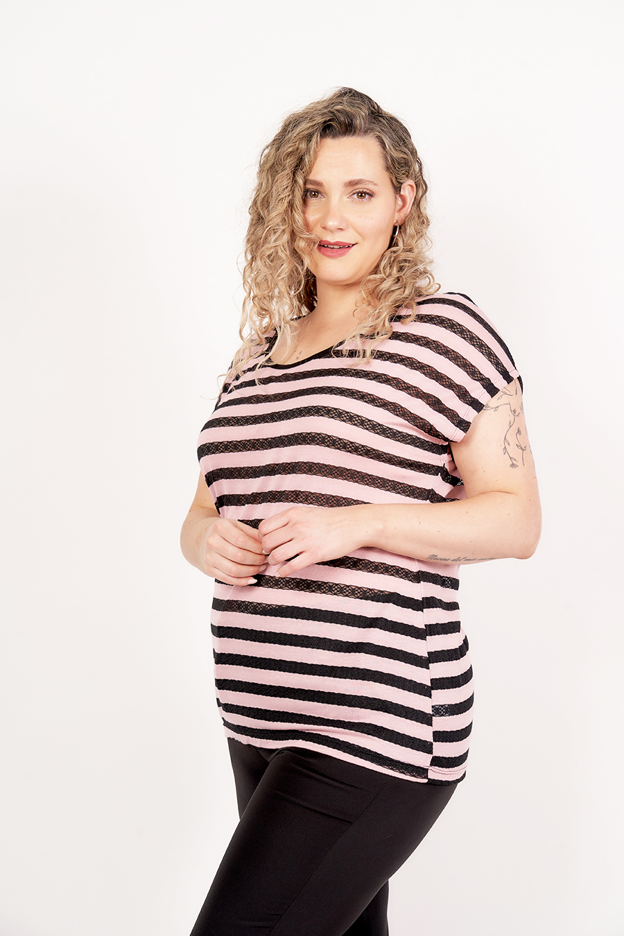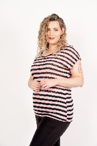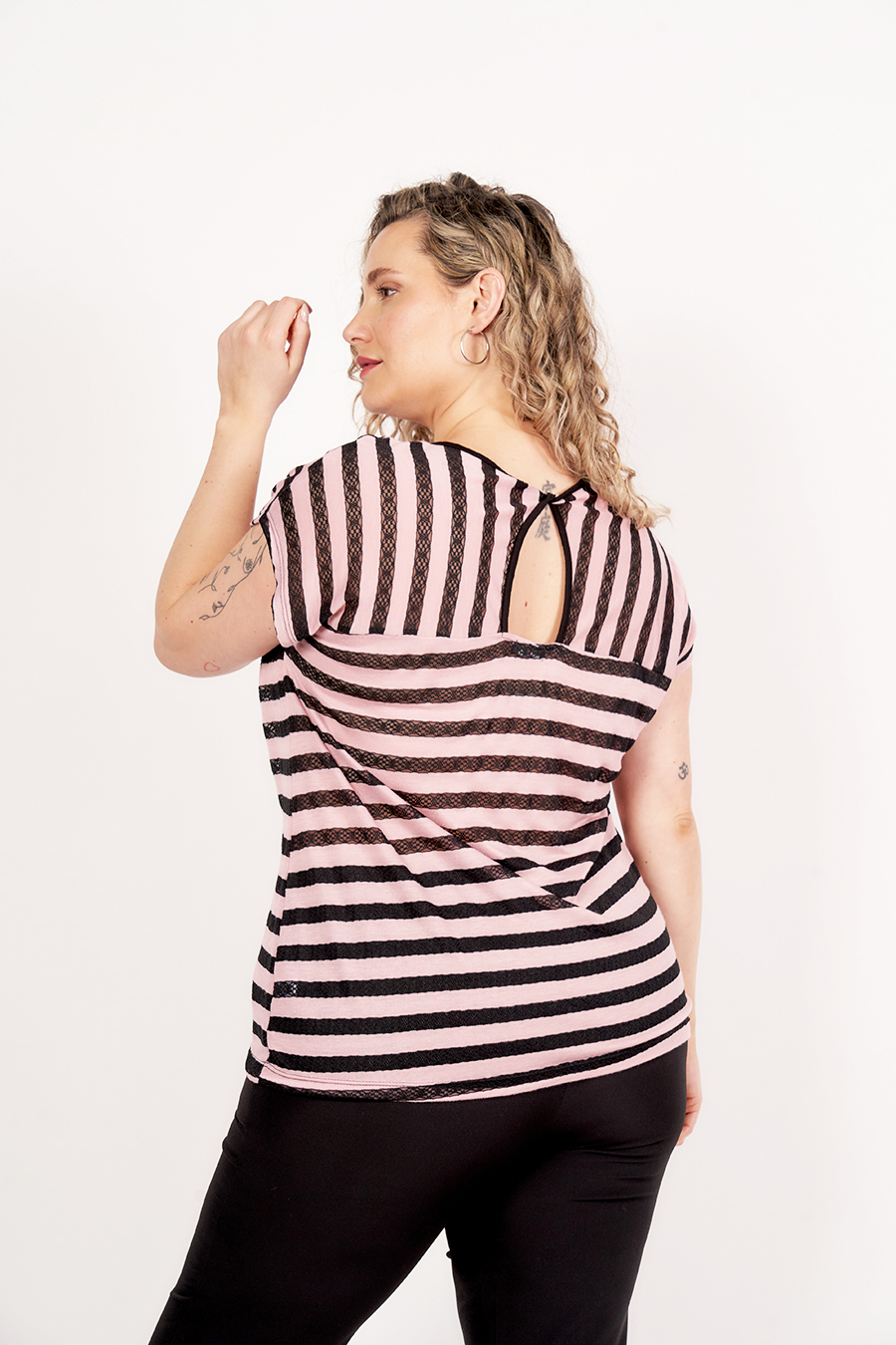 REMERA MILENA. ESCOTE U Y MANGA JAPONESA, ESPALDA RECORTE LAGRIMA CON NUDO. TEJIDO ENCAJE GINGKO RAYADA COMBINADA.