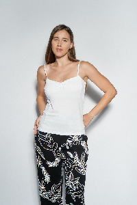 TOP OLIVIA. ESCOTE V CON FRUNCE Y BRETEL FINITO, DETALLE FRENTE CON RECORTE. TEJIDO MODAL CREPE LISO.