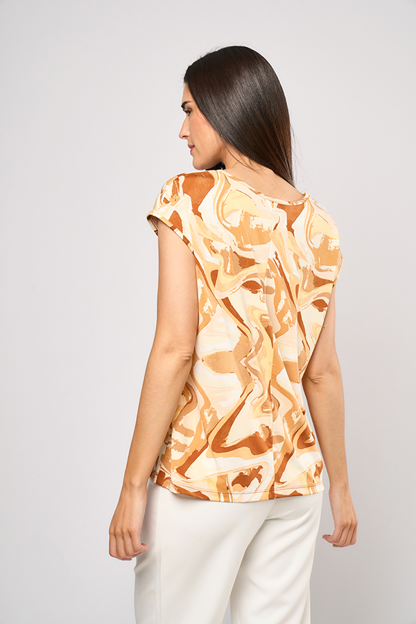 REMERA BRITNEY. ESCOTE BASE CON MANGA CAIDA. TEJIDO VENECIA ESTAMPADA.