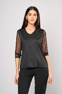 REMERA ANABEL. ESCOTE V Y MANGA 3/4 DE TULL, FRENTE CON APLIQUES STRASS. TEJIDO MICROFIBRA LISO.