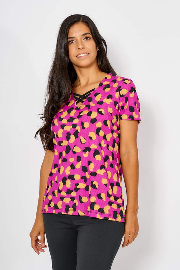 REMERA NIKITA. ESCOTE V CON TIRITAS ENTRELAZADAS Y MANGA CORTA. TEJIDO MORLEY ESTAMPADO.