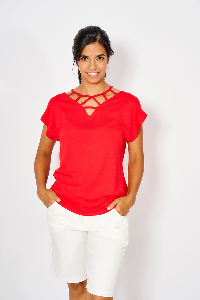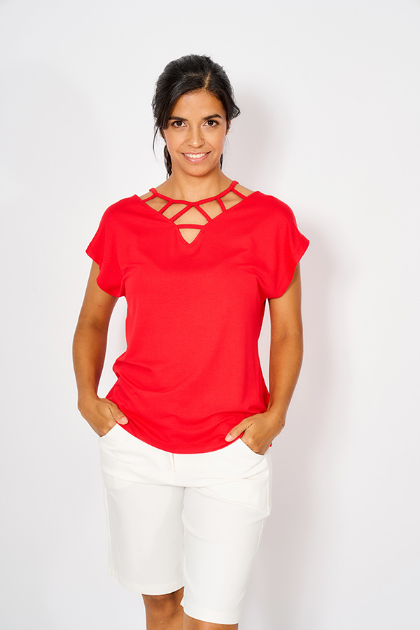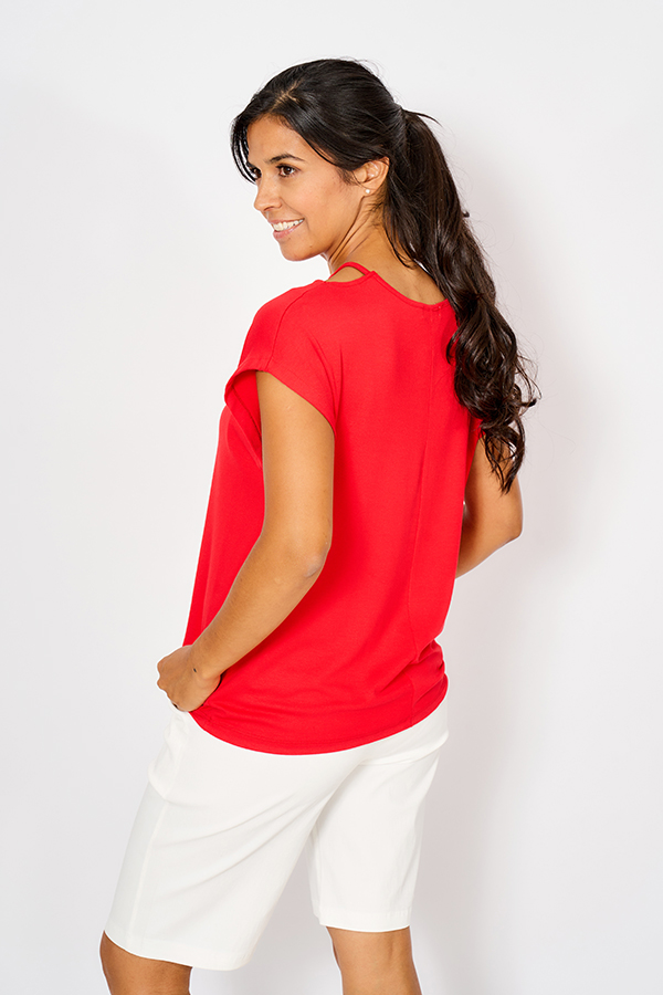 REMERA GEORGINA. ESCOTE V CON MULTITIRITAS Y MANGA JAPONESA. TEJIDO MODAL CREPE LISO.