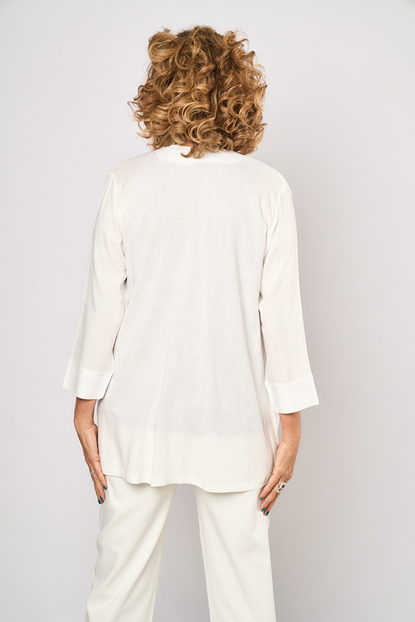 SPOLVERINO JACINTA. VISTA CON SOLAPA Y MANGA 3/4. DETALLE FRENTE CON RECORTE Y DOS BOLSILLOS PLAQUE. TEJIDO LINO SLUB LISO.
