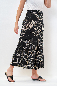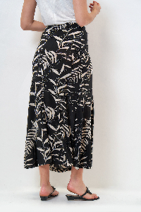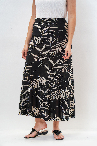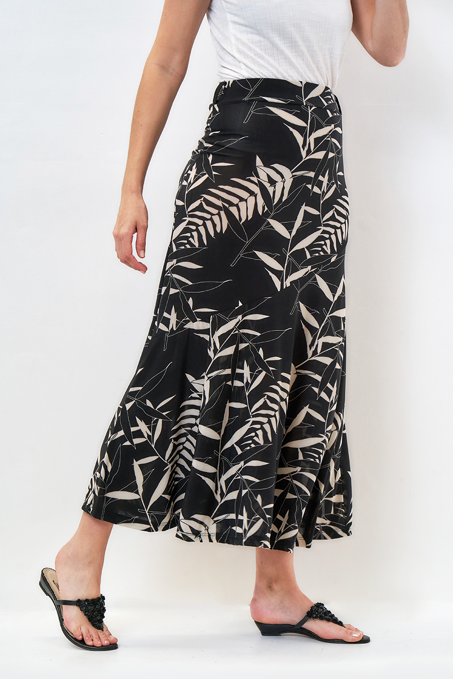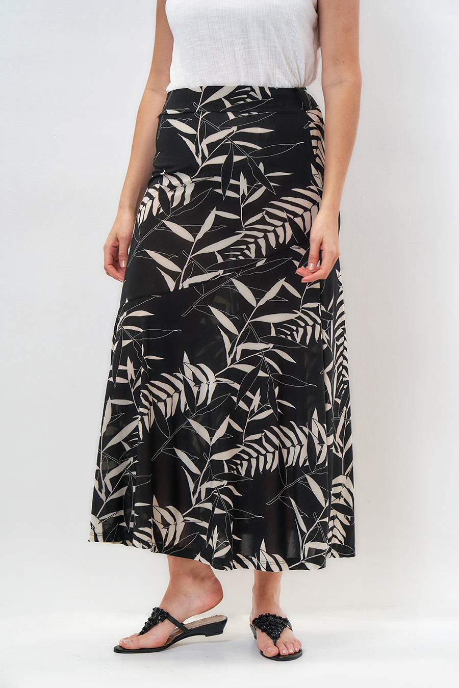 POLLERA IRIS LARGA. CINTURA CON ELASTICO Y PRESILLAS CON DETALLE LAZO; TERMINACION EVASE CON RECORTES. TEJIDO VENECIA ESTAMPADO HOJAS.
