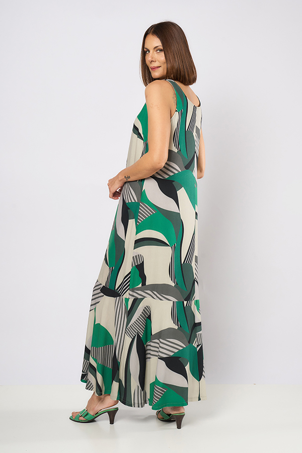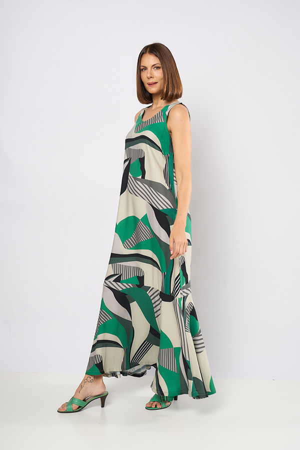 VESTIDO LUANA LARGO. ESCOTE U SIN MANGAS, TERMINACION RECORTE CON VOLADOS. TEJIDO VILLELA ESTAMPADO.