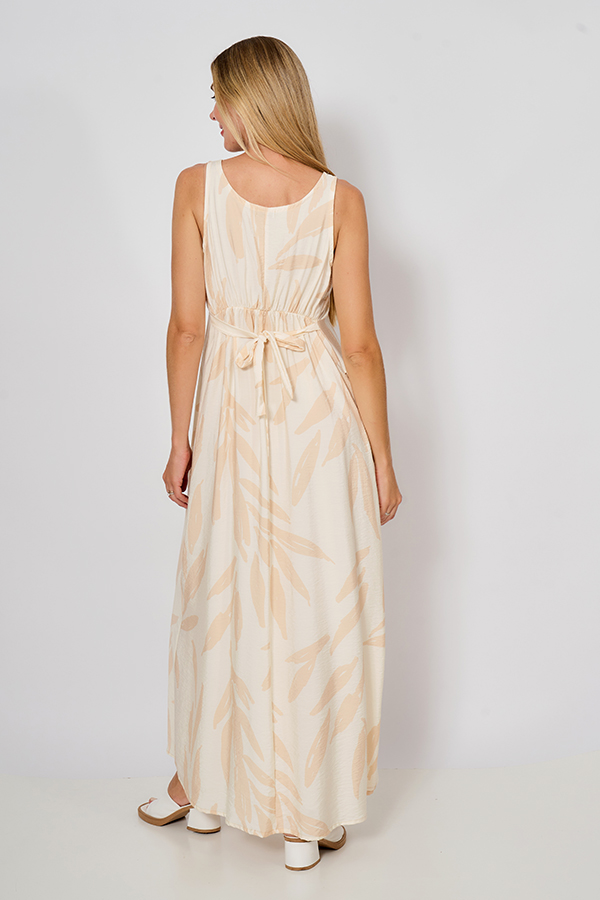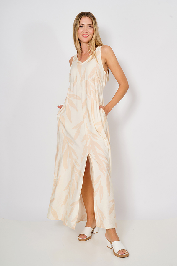 SOLERO LAILA. ESCOTE V SIN MANGAS Y CINTURA CON ELASTICO Y LAZO, DETALLE FRENTE CON TAJO. TEJIDO VISCOSA ESTAMPADA.