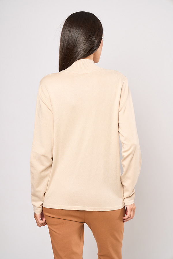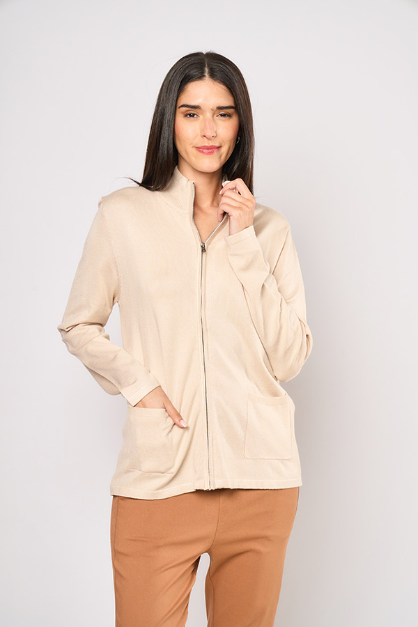 CAMPERITA GIULIA. CUELLO ALTO Y MANGA LARGA, DETALLE FRENTE CON DOS BOLSILLOS PLAQUE, VISTAS COMBINADO MORLEY. TEJIDO SPANDEX LISO.