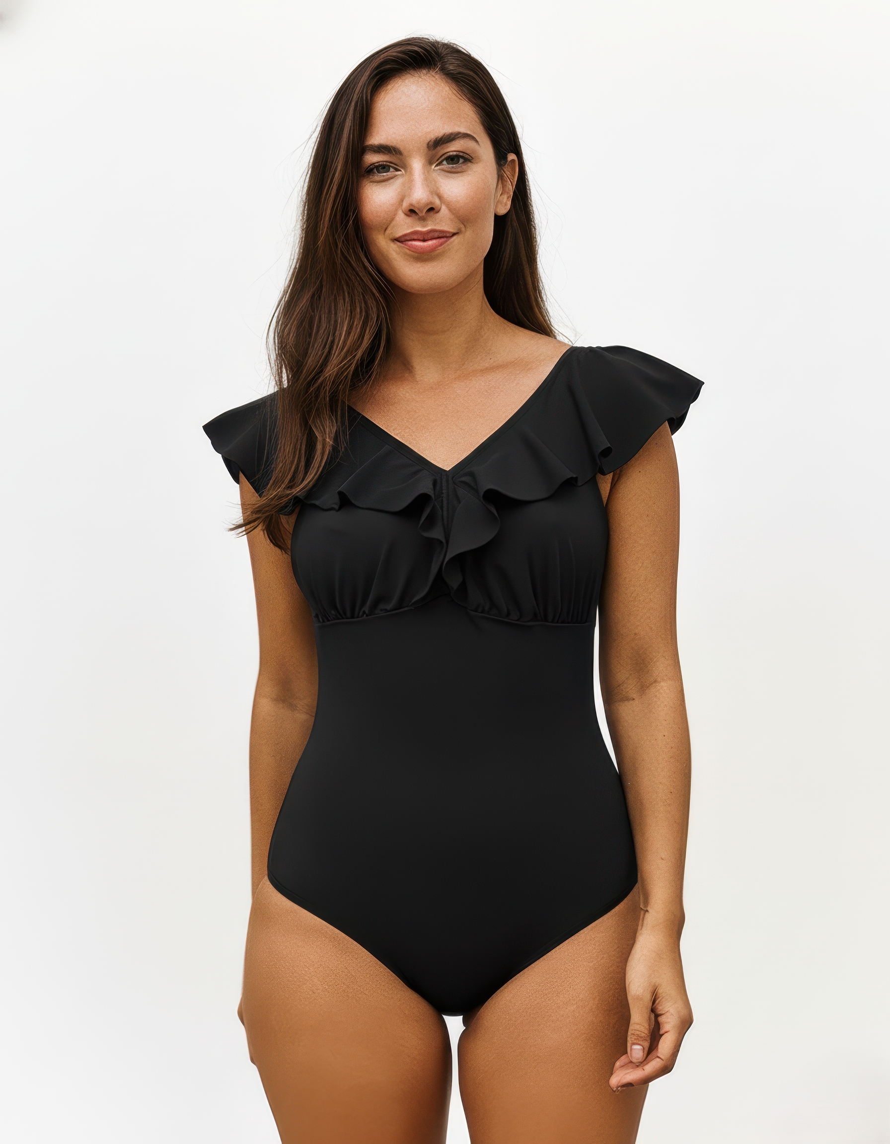 MALLA. ESCOTE V CLASICA, CON RECORTES Y VOLADOS. TEJIDO LYCRA CON SPANDEX LISO.