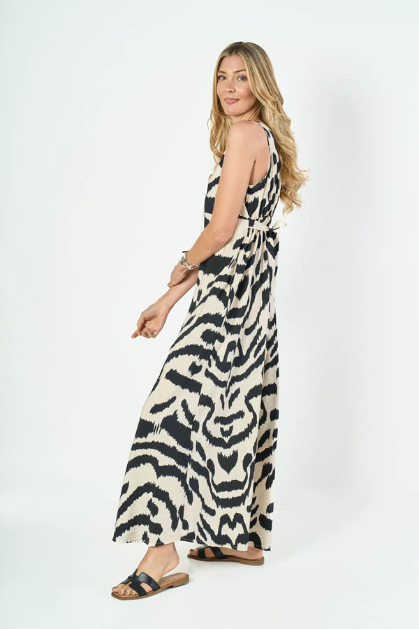 VESTIDO PETRA LARGO. ESCOTE V SIN MANGAS Y BOLSILLOS, CINTURA CON ELASTICO Y LAZO, DETALLE FRENTE CON TAJO. TEJIDO VISCOSA ESTAMPADA.