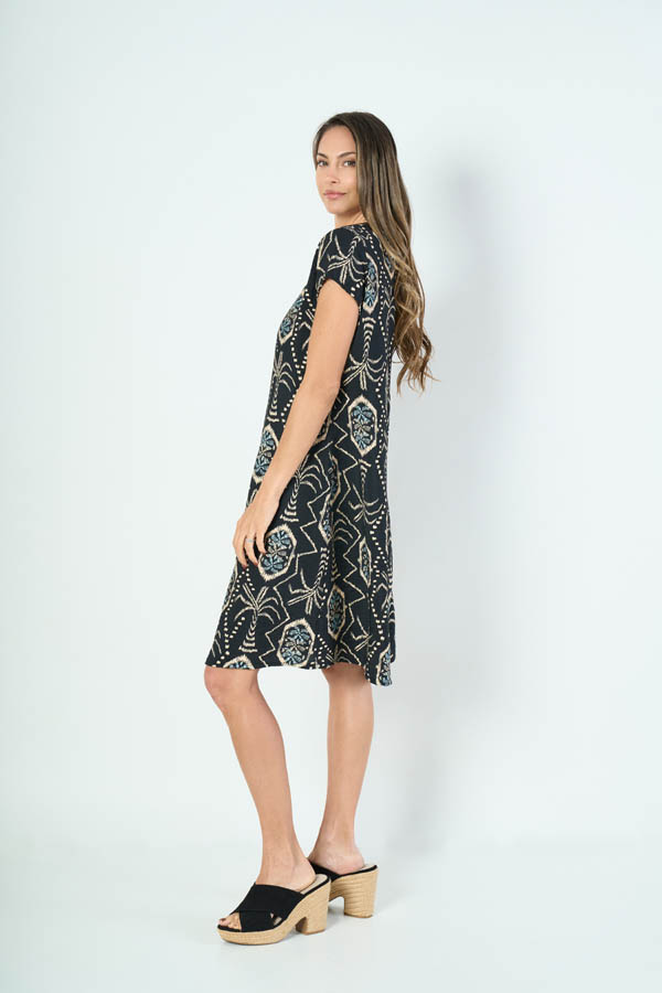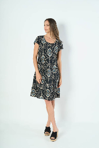 VESTIDO SILVIA. ESCOTE U CON MEDIA MANGA, TERMINACION EVASEE. TEJIDO VISCOSA ESTAMPADA.