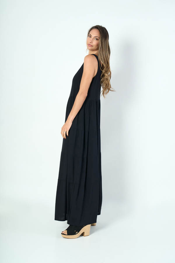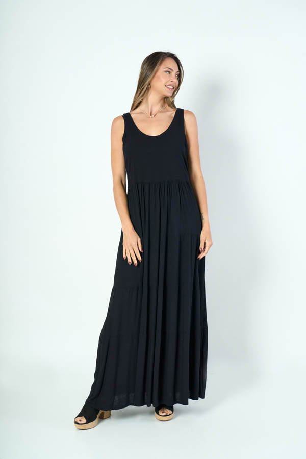 VESTIDO TRIANA LARGO. ESCOTE U SIN MANGAS, DETALLE FALDA 4 VOLADOS. TEJIDO LINO SLUB LISO.