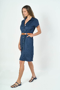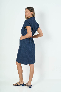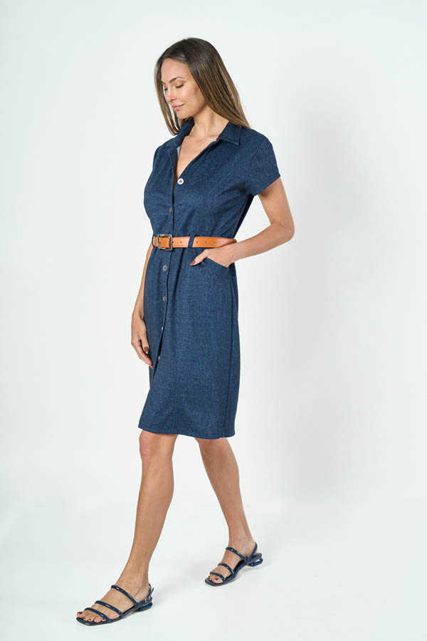 VESTIDO CHEMISE NADIA. CUELLO SOLAPA CON MANGA CORTA, RECORTE ENTALLADO CON PESPUNTE, CINTURA CON PRESILLAS Y BOLSILLOS LATERALES. TEJIDO PUNTO ROMA DENIM LISO.