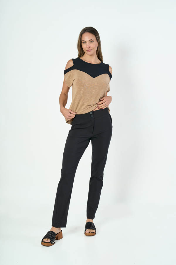 PANTALON ZULEMA. CINTURA ANCHA, DETALLE SIMULA BOLSILLOS DIAGONALES CON VIVO. TEJIDO BENGALINA LISA.