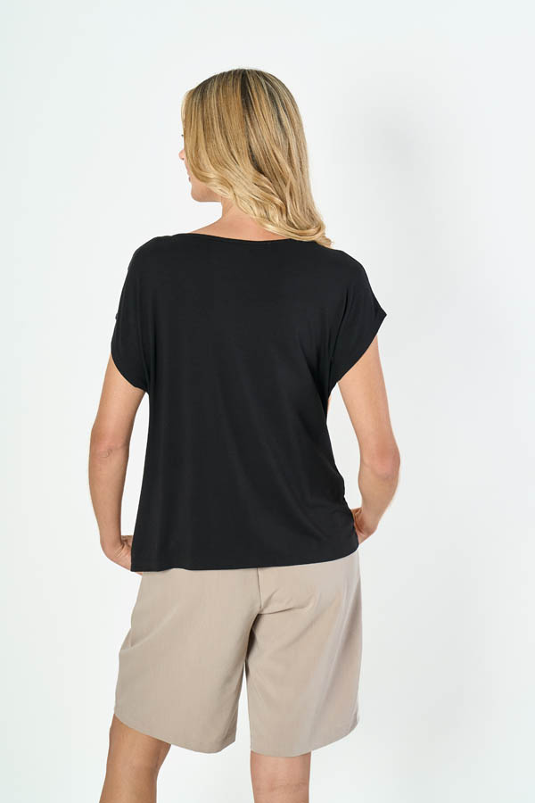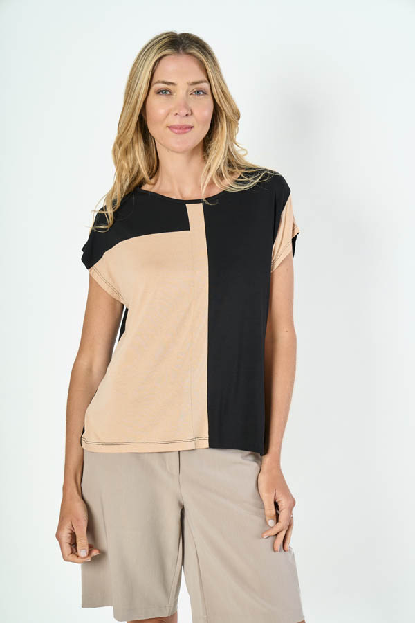REMERA URSULA. ESCOTE U FRENTE CON RECORTES COMBINADOS Y MANGA JAPONESA. TEJIDO MODAL CREPE LISO.