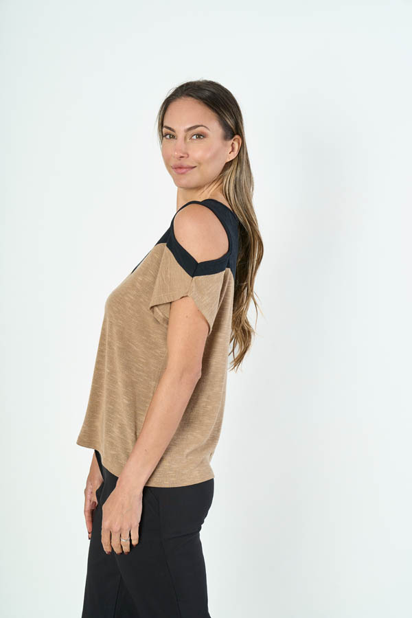 REMERA RENATA. ESCOTE BASE CON RECORTE COMBINADO Y MANGA JAPONESA. DETALLE HOMBROS DESCUBIERTOS. TEJIDO MODAL FLAME LISO.