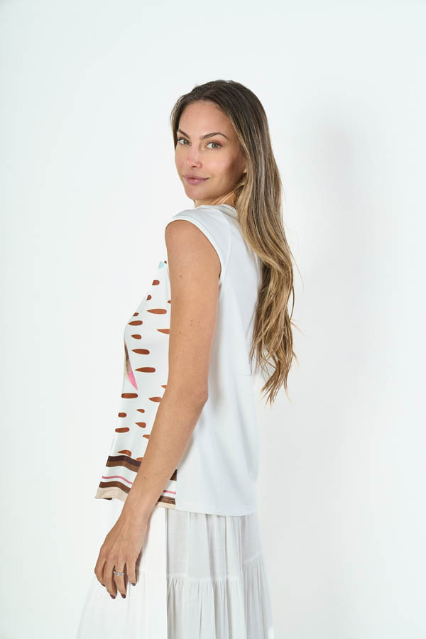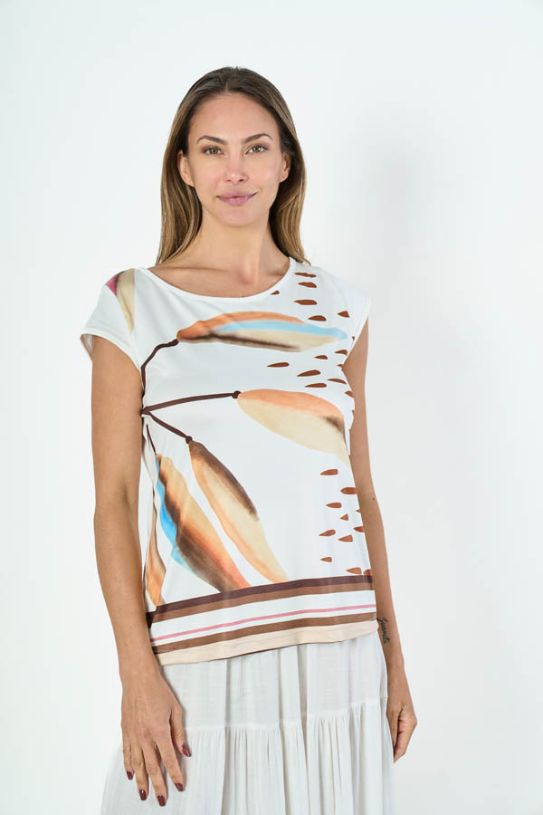REMERA ELBA. ESCOTE BOTE Y MEDIA MANGA, DETALLE EN FRENTE CON ESTAMPA DE HOJAS. TEJIDO MICROFIBRA LISO.