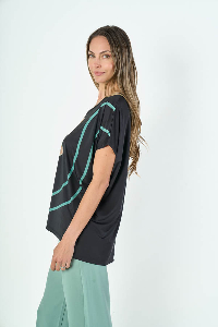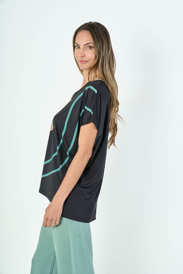 REMERA CARMEN CONICA. ESCOTE V Y MANGA JAPONESA, DETALLE FRENTE CON ESTAMPA FLOR HISBICO COMBINADA CON ANIMAL PRINTE. TERMINACION TAJITOS A LOS COSTADOS. VENECIA NAPOLES.