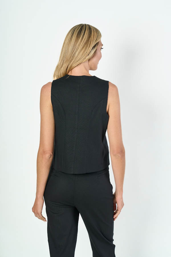 CHALECO SHEILA. ESCOTE V Y BOLSILLO OJAL, TERMINACIÓN EN PICO. TEJIDO LINO LISO.