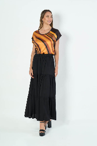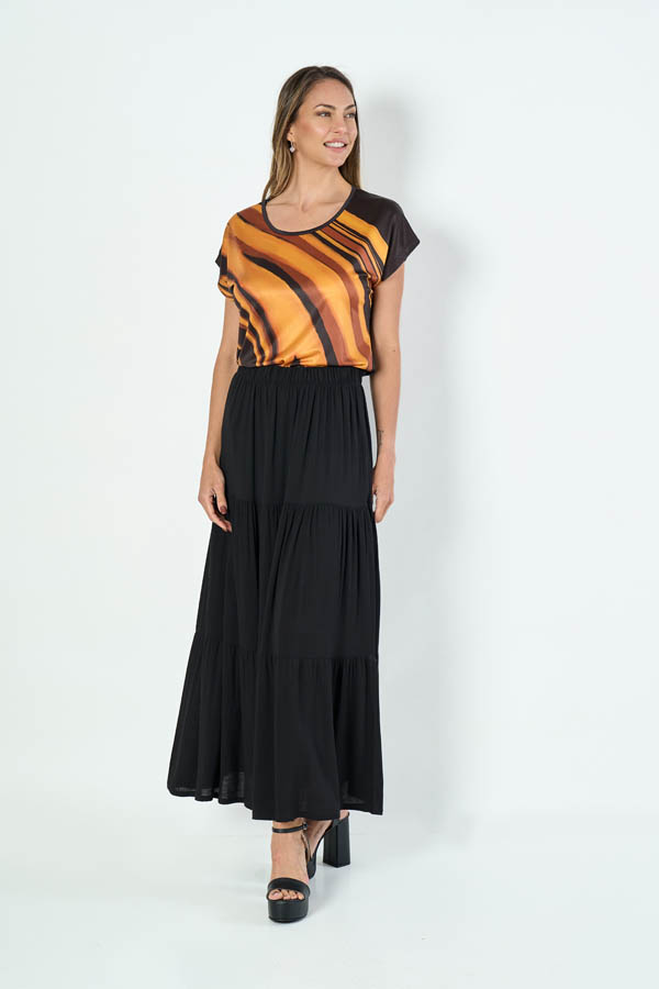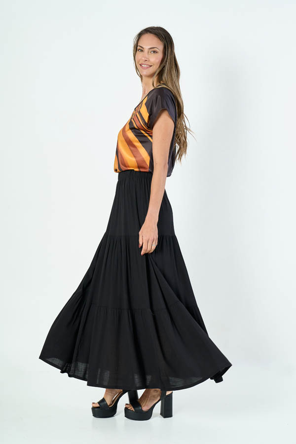 POLLERA TANIA LARGA. CINTURA CON ELASTICO, FALDA 3 VOLADOS. TEJIDO LINO SLUB LISO.