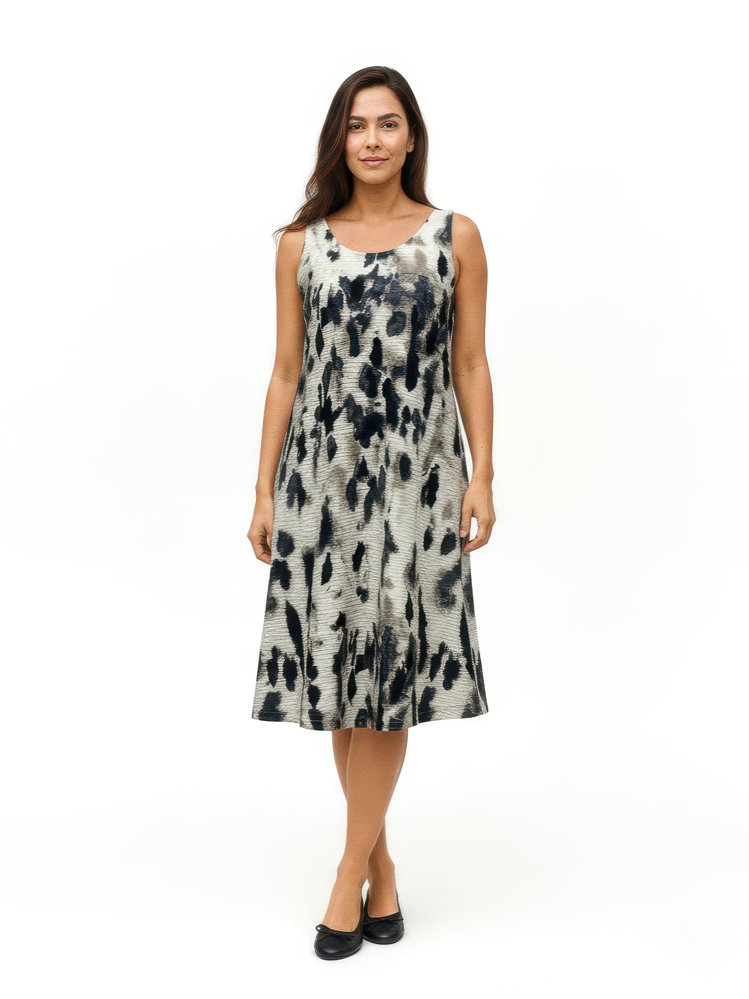 SOLERO ALFONSA. ESCOTE BASE SIN MANGAS, DETALLE ESPALDA SIMULA NUDO Y BOLSILLOS LATERALES. TEJIDO VISCOSA ESTAMPADO MANCHAS.