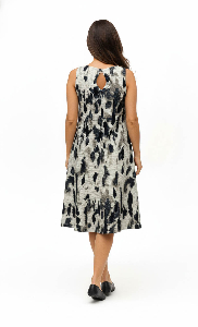 Solero Alfonsa, de escote base sin mangas, con un original detalle en la espalda que simula un nudo y bolsillos laterales funcionales. Confeccionado en viscosa estampada con diseño de manchas, es liviano, fresco y cómodo, perfecto para el día a día.