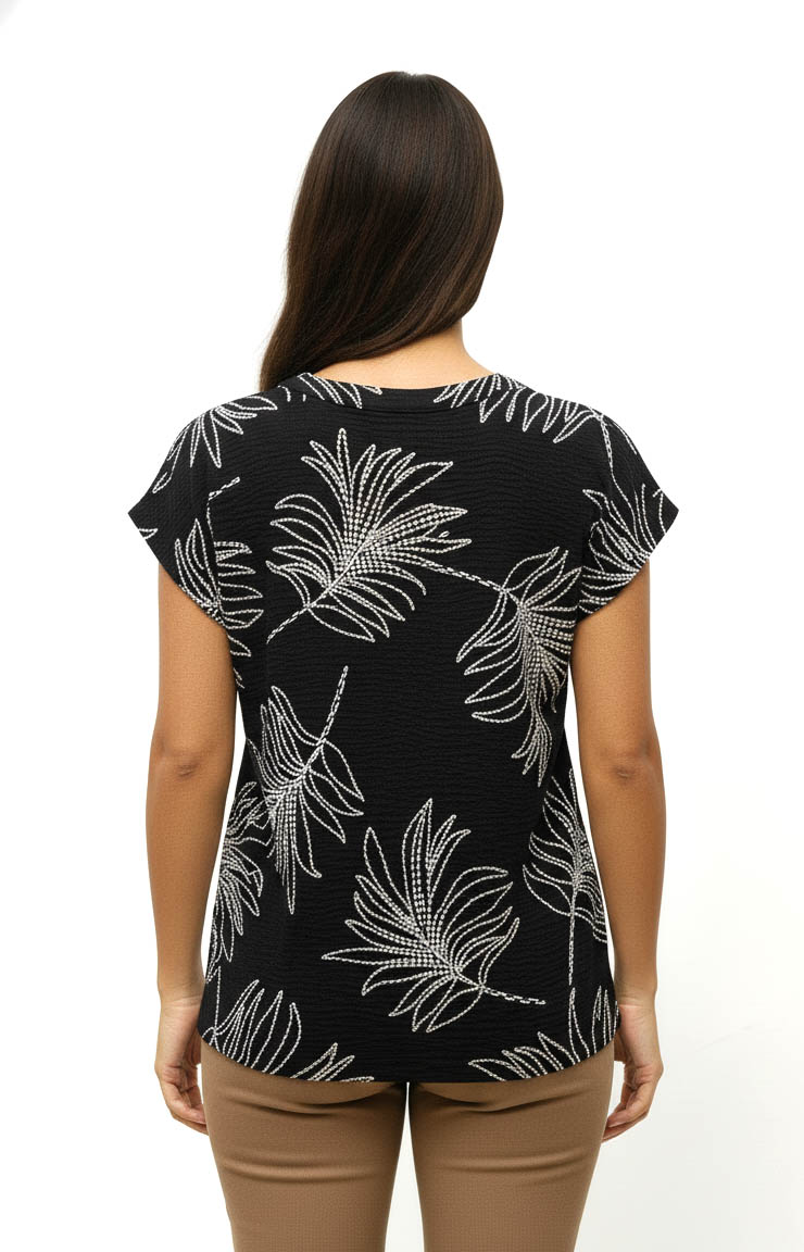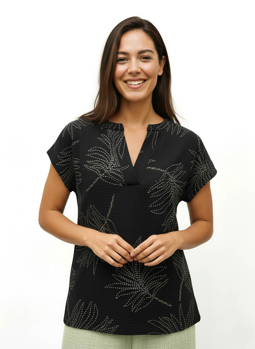 189 BLUSA ELIDA. CUELLO MAO Y MANGA JAPONESA. TEJIDO CEY SIMIL BORDADO HOJAS.