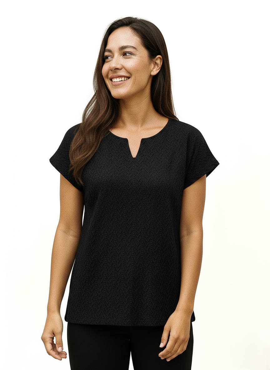 Remera Selene. Con escote fantasía y manga japonesa, destaca por su diseño de rectángulos intercalados. Confeccionada en broderie de punto liso, suma un toque moderno y canchero a cualquier look.