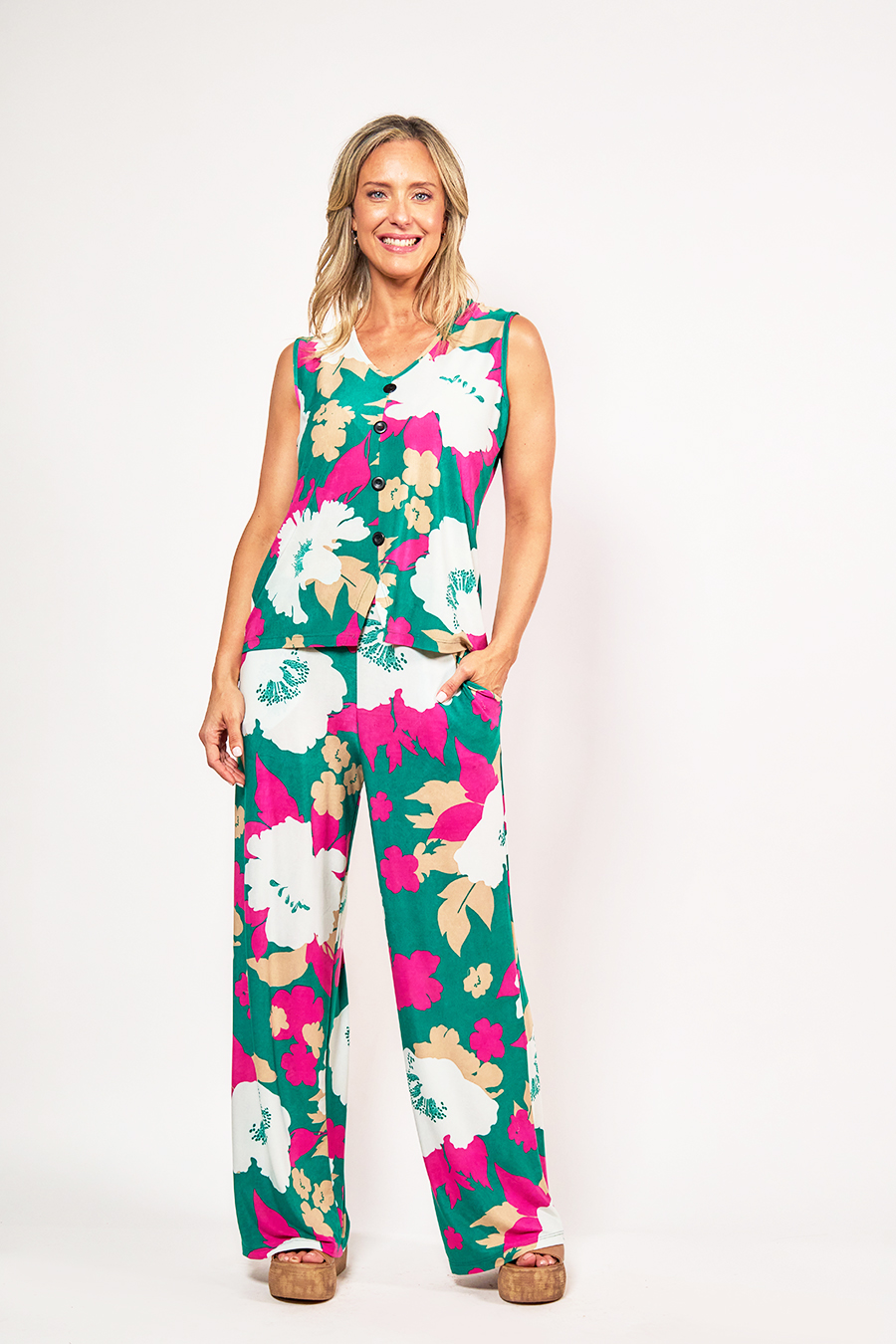 132 PANTALON PALAZZO CRISTAL. CINTURA CON ELASTICO Y BOLSILLOS LATERALES. TEJIDO VENECIA ESTAMPADO FLORES.