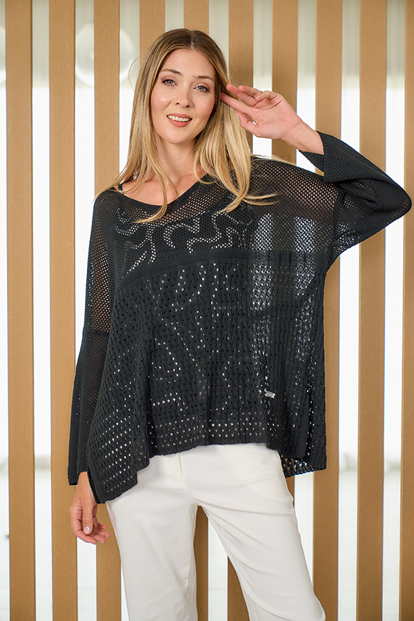 SWEATER OVERSIZE EMMA. ESCOTE V Y MANGA LARGA, TEJIDO DE PUNTO RELIEVE OCHOS Y CALADO CIRCULITOS.