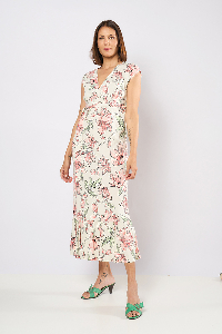 100 VESTIDO AYLIN. ESCOTE CRUZADO CON MANGA JAPONESA, DETALLE CINTURA CON RECORTE Y LAZO. TERMINACION CON VOLADOS. TEJIDO LINO ESTAMPADO FLOR DE LOTO.