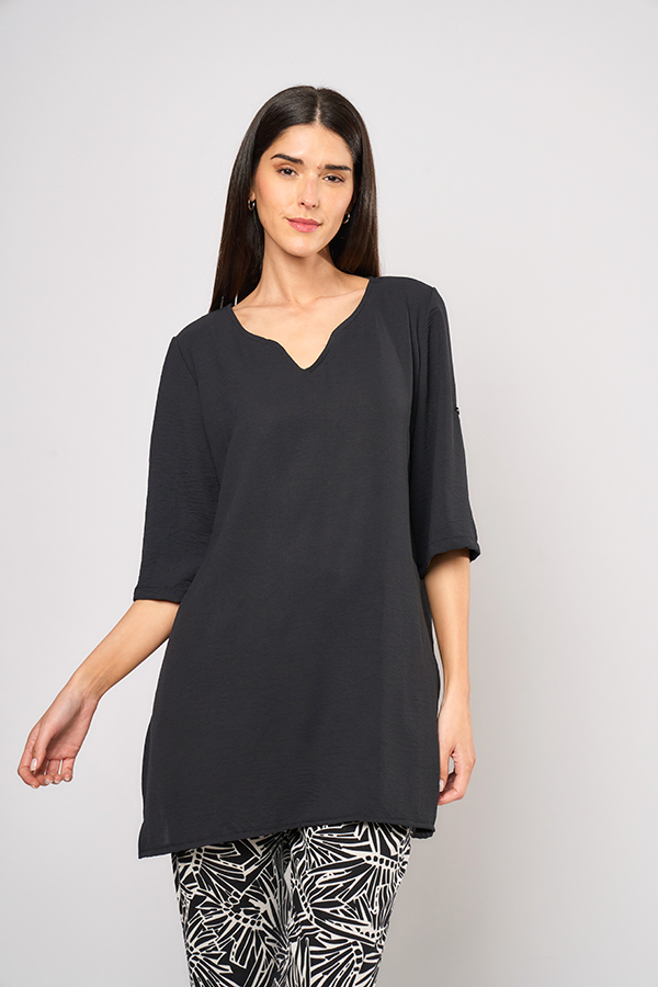 99 TUNICA LUCIA. ESCOTE FANTASIA Y MANGA 3/4 CON TRABA, DETALLE TERMINACION TAJITOS A LOS COSTADOS. TEJIDO CEY KENIA LISO.