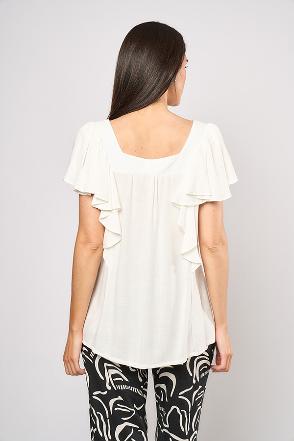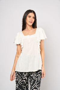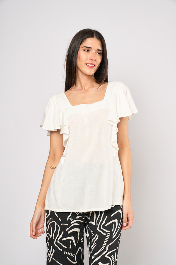 98 BLUSA DORIS. ESCOTE CUADRADO INCRUSTADO, SIN MANGAS CON APLIQUE VOLADO. TEJIDO LINO LISO SLUB.
