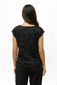 Remera Natacha. Escote base y manga caída que aportan un calce relajado. Confeccionada en tejido paliet con florcitas bordadas de lentejuelas, ideal para un look delicado con brillo sutil.