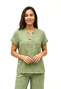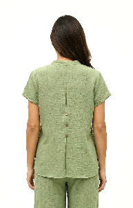 Blusa Daniela . Con cuello mao y manga corta, con un delicado trabajo de tablitas y botoncitos en la espalda que la hacen única. Confeccionada en lino balear liso, liviano y fresco, ideal para un look relajado pero con estilo