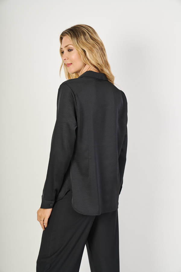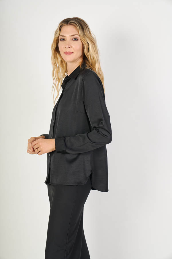 Camisa Paz , clásica infaltable. Cuello solapa y manga larga para un look elegante y versátil. Confeccionada en raso liso, con caída suave y brillo sutil, ideal para llevar tanto en outfits formales como más relajados.