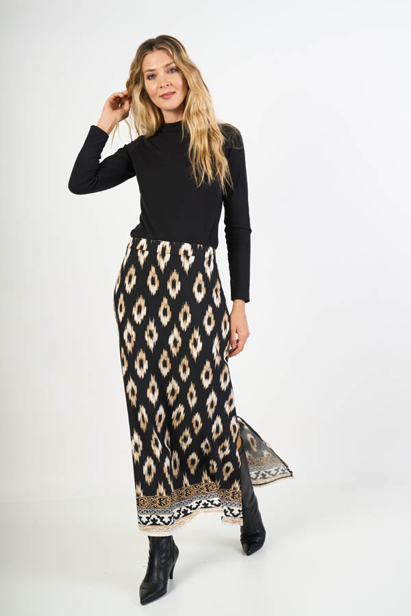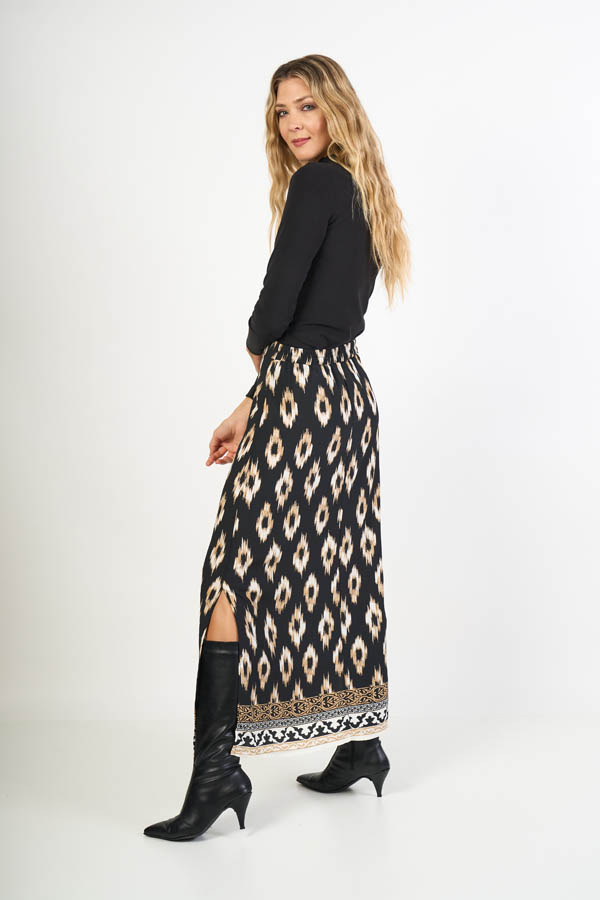 Pollera Sarah , larga y con movimiento. Cintura con elástico en la espalda para un calce cómodo, tajos a los costados que aportan fluidez y detalle de guarda en la terminación que suma diseño. Confeccionada en viscosa estampada, liviana y fresca.