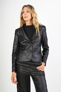 Blazer Lily , corto y con mucha actitud. Cuello solapa y manga larga, con recorte entallado y bolsillos ojal que definen la silueta. Confeccionado en scuba cuero craquelado liso, con textura y presencia, ideal para un look urbano y súper canchero.