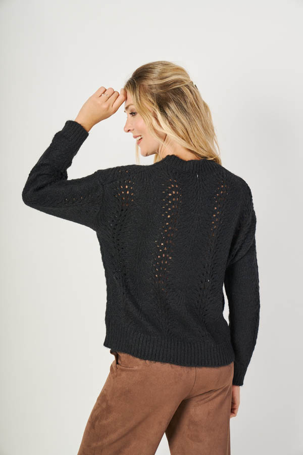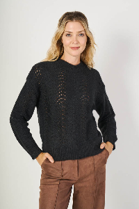 Sweater Narella, liviano y delicado. Escote en U calado y terminaciones en morley que aportan textura y un toque femenino. Confeccionado en lana mohair lisa, suave y abrigada, ideal para un look elegante y relajado a la vez.