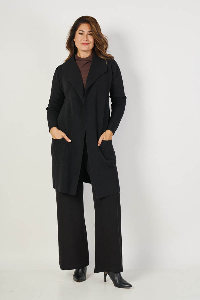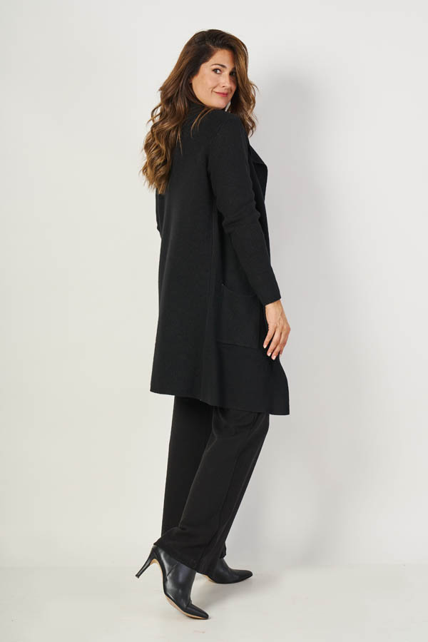 Saco Largo Madrid, elegante y moderno. Cuello smoking y manga larga, con vistas combinadas en morley. Detalle de dos bolsillos plaqué que suman funcionalidad. Confeccionado en cashmere liso, suave y abrigado, ideal para un look sofisticado y urbano.