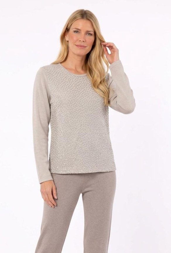 Remera Patricia , clásica con un toque de brillo. Escote base y manga larga, con detalle de apliques de canutillos en el frente que realzan el diseño. Confeccionada en lanilla lisa, suave y abrigada, ideal para un look elegante y cómodo a la vez.