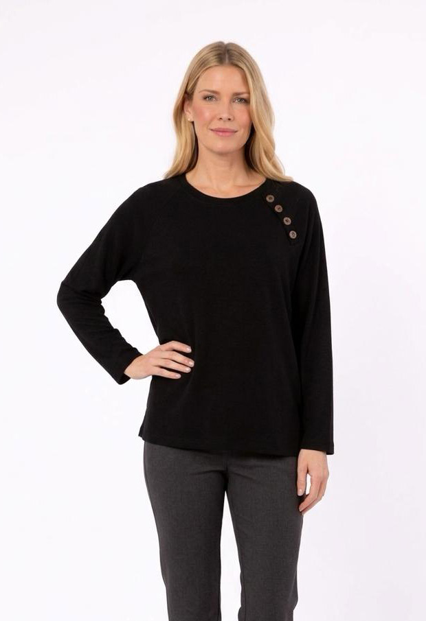 Remera Joaquina , clásica con detalle. Escote en U y manga larga, con pestaña con botones que aporta un toque original. Confeccionada en lanilla angora towel lisa, suave y abrigada, ideal para un look cómodo y con estilo.